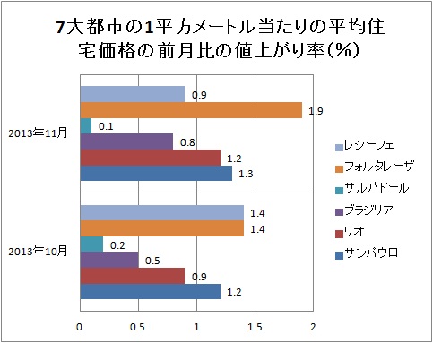 11月のサルバドール市の平均住宅価格は前月比0.1%上昇、サン・ベルナルド・ド・カンポス市は0.7%、ブラジリア市は0.8%それぞれ上昇している。(2013年12月4日付けエスタード紙)
