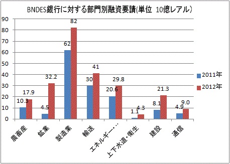 昨年の工業部門の融資要請は前年比72%増加の1,152億レアル、融資された金額は前年比31%増加の476億レアル、石油・天然ガス開発などの鉱業部門の融資要請は619%増加の322億レアルであった。(2013年1月13日付けヴァロール紙)