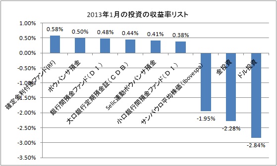 IGP-M指数0.34%を下回った投資として、昨年7月以来初めてR$2.00を下回ったドル投資の収益率がマイナス2.84%と最低を記録、金投資もマイナス2.28%、サンパウロ平均株価(Ibovespa)は、ペトロブラス石油公社の普通株がマイナス7.06%、優先株がマイナス7.48%とそれぞれ大幅に値下がりした影響で、マイナス1.95%を記録している。(2013年2月1日付けエスタード紙)
