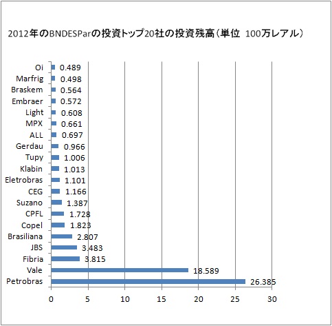 BNDESPar会社の昨年末の出資している企業の時価総額は745億レアル、そのうち主要5セクターの時価総額は663億レアル、82億レアルがそれ以外のセクターへの投資であった。