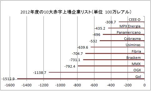 ゴール航空に続く2012年の赤字企業は、実業家エイケ・バチスタ氏の石油・天然ガス開発企業OGX社の11億3,870万レアル、 MMX 社の7億9,240万レアル並びにエネルギー部門のMPX 社も大きな赤字を計上している。