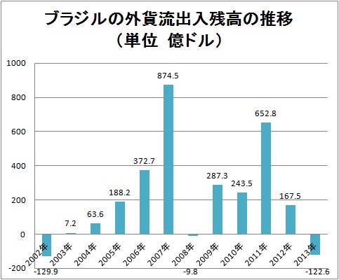 2013年のブラジルの外貨流出は、外貨流入を122億6,000万ドル上回って2002年の130億ドルの外貨流出残高に次ぐ記録となり、昨年のレアル通貨に対するドルの為替は、米国の連邦準備制度理事会(FRB)が量的緩和を縮小する可能性の発表や低調な国内経済の見通しなどが要因となって15%上昇している。