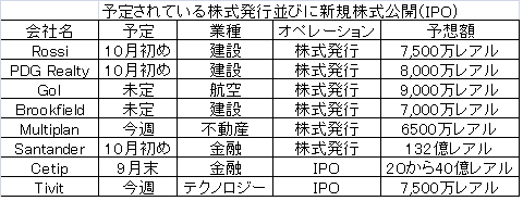 今後はCetip社並びにTivit社がIPOを予定、また6社が株式を発行して220億レアルの資金調達を予定、内訳は建設業が3社、中小銀行が2社、情報テクノロジー関連が2社となっている。
