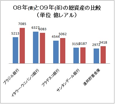 2008年末のイタウー-ウニバンコ銀行の総資産はブラジル銀行を1,110億レアル上回っていたが、金融危機で民間銀行がクレジット部門を大幅に縮小したために、ブラジル銀行は連邦政府の要請を受けてクレジット部門を果敢に拡大したために首位を奪還した。
