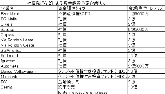 その他ではCyrela Commercial Properties 社、SulAmerica社、 Redecard社並びに Autometal社が社債発行、Brookfield社は不動産債権(CRI)、Volkswagen銀行並びにMonsanto社がクレジット債権付き投資ファンドを通して、資金調達を予定している。(2012年1月10日付けヴァロール紙)