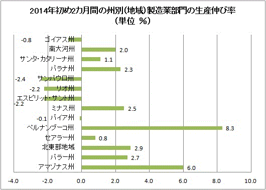 今年初め2カ月間のアマゾナス州の製造部門の生産は前年同期比6.0%、パラー州は2.7%、北東地域は2.9%、セアラー州は2.9%、ペルナンブーコ州は8.3%、ミナス州は2.5%、パラナ州は2.3%、サンタ・カタリーナ州は1.1%、南大河州は2.0%それぞれ増加している。