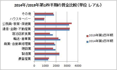 また建設セクターは7.2%減少、輸送関連セクターは16.3%減少した一方で、農畜産セクターは5.2%増加、公務員は7.2%増加して過去5年間の実質賃金が最も増加している。