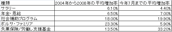 2004年から2008年にかけて同プログラムの年間平均支出は18%増加、サラリーは僅かに6.1%、年金・恩給向け支出は6.5%の増加にとどまっている。