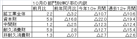 10月の資本財並びに耐久消費財の伸び率はそれぞれ前月比5.9%増加して鉱工業部門を牽引、しかし鉱工業部門の前年同月比ではマイナス3.2%、今年10ヶ月間ではマイナス10.7%、過去12ヶ月間ではマイナス10.6%となっている。(2009年12月3日付けエスタード紙)
