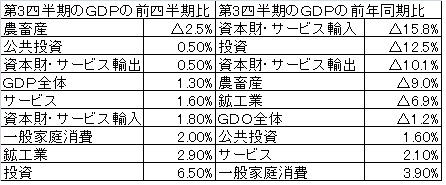 第3四半期の鉱工業部門は前四半期比2.9%並びに投資は6.5%とそれぞれ増加、しかし農畜産部門のGDPは前四半期比マイナス2.5%、前年同期比マイナス9.0%と大幅に落込んだ。