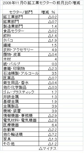昨年11月の鉱工業部門の伸び率は前月比マイナス0.2%と前月まで10カ月連続の増加から一転してマイナスに転じたのは前月の伸び率が非常に高かったためであり、前年同月比では5.1%増加している。
