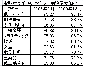 金融危機後に設備稼働率が減少したのは紙・パルプセクターが93.2%から90.4%、輸送関連92.5%から88.5%、非鉄金属89.3%から86.6%、機械87.8%から83.7%、食品セクターが84.6%から81.6%とそれぞれ減少している。