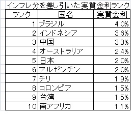 今回のSelic金利の据え置きでブラジルのインフレ分を差引いた実質金利は4.0%と再び世界トップ、2位はインドネシアの3.6%、中国3.3%、オーストラリア2.4%、日本並びにアルゼンチンが2.0%、チリ1.9%、コロンビア並びに台湾1.5%、南アフリカが1.1%で10位となっている。(2010年1月28日付けエスタード紙)