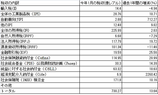 1月の国庫庁の税収は政策誘導金利(Selic)の引上げが予想され、多くの企業で法人所得税(IRPJ)並びに純益に対する社会納付金(CSLL)の前払いが増加したために、インフレ分を差引いた実質税収は前年同月比13.64%増加の730億2,000万レアルを記録した。