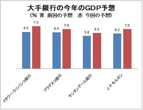 イタウー-ウニバンコ銀行はギリシャの財政問題に端を発したユーロ圏の財務基盤の弱い国の財政赤字削減能力に対する懸念が払拭しきれないことや財政緊縮策が欧州の経済成長に与える影響に対する懸念にも関わらず、今年のGDPを6.5%から7.5%と1985年以来の伸び率に上方修正している。