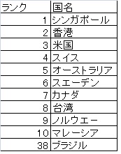 ランクトップは昨年の3位から上昇したシンガポール、2位は昨年に続いて香港、米国は初めてトップの座から3位に後退、4位はスイス、5位はオーストラリア、6位スエーデン、カナダ、台湾、ノルウエ-、マレーシアが10位となっている。
