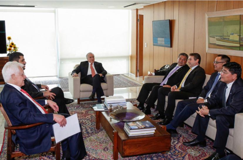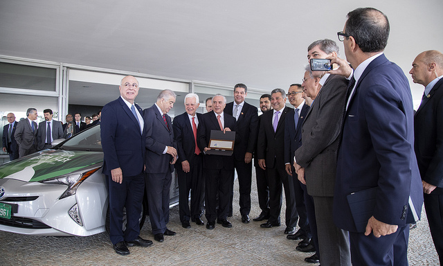 リージョナルCEOのSteve St.Angeloやブラジルトヨタの社長Rafael Changらが、テメル大統領と面会し、現地生産のコミットメントを伝えるもの。
