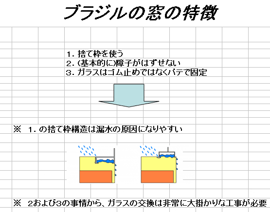 ブラジルの窓と日本の窓の取り付け方にはここに挙げたような違いがあります。1番目の「捨て枠をう」という工法が、構造上日本の窓よりも漏水しやすい取付け方法だといえます。壁はレンガ若しくはコンクリートブロックで作るということから来ています。2番目の「障子が外せない」ということと3番目の「ガラスはパテで固定されている」という事は、もし万が一ガラスが割れた場合にはガラスを取り替えるのに窓を解体しなければならないということで、非常に大掛かりな作業となってしまいますのでご注意下さい。 |