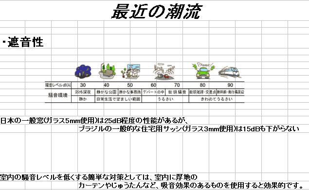 窓の遮音性については、残念ながらブラジルの一般的な窓は日本のものと比べて遮音性は高くありません。よく「厚いガラスにしたら遮音は良くなりますか」と聞かれるのですが、この方法はお金がかかる割には、期待するほど良くならないというのが実情です。そこで、うるさくてお困りの方は、厚手のカーテンを床までたらし、ふかふかのじゅうたんを敷いてみて下さい。ガラスの厚さを代えよりもお手ごろに、ひょっとしたらよりすぐれた効果が期待できるかもしれません。一度お試し下さい。 |